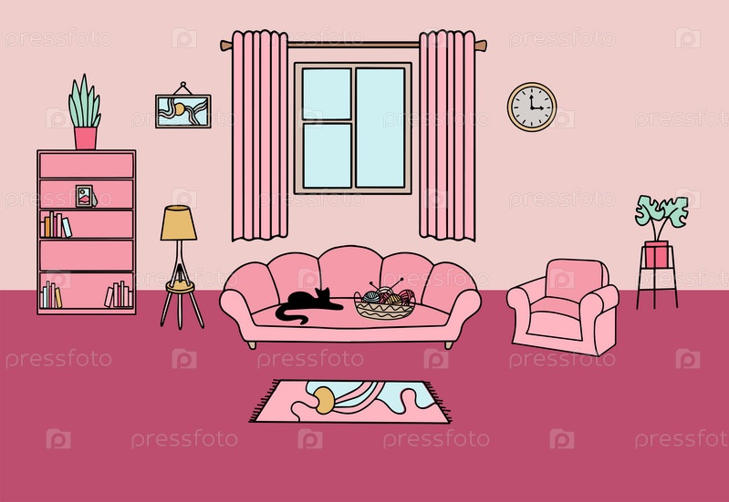 Иллюстрация интерьера гостиной в розовых тонах. Векторная иллюстрация