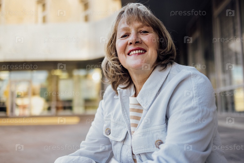 Крупный план портрета красивой женщины средних лет, позирующей на ступеньках на улице