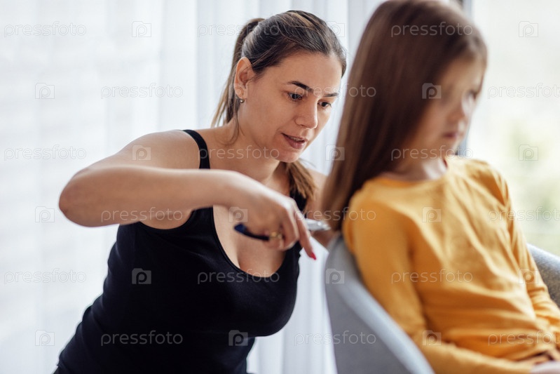Молодая улыбающаяся мать стрижет волосы своей милой маленькой дочери