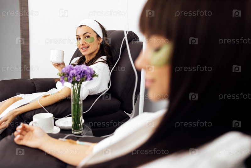 Две кавказские девушки в халатах делают оздоровительные капельницы с витаминами в салоне красоты. Внутривенная витаминотерапия