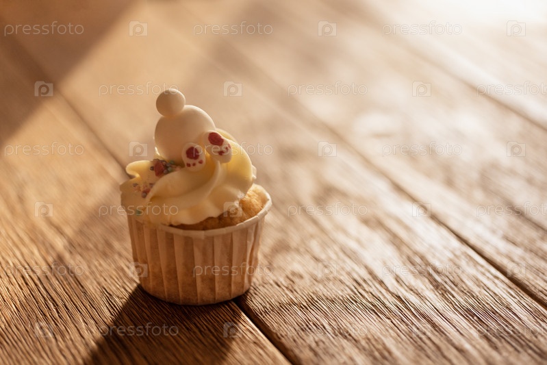 Милый вкусный детский кекс с сырным кремом, сахарной начинкой и кроличьими лапками на деревянном столе