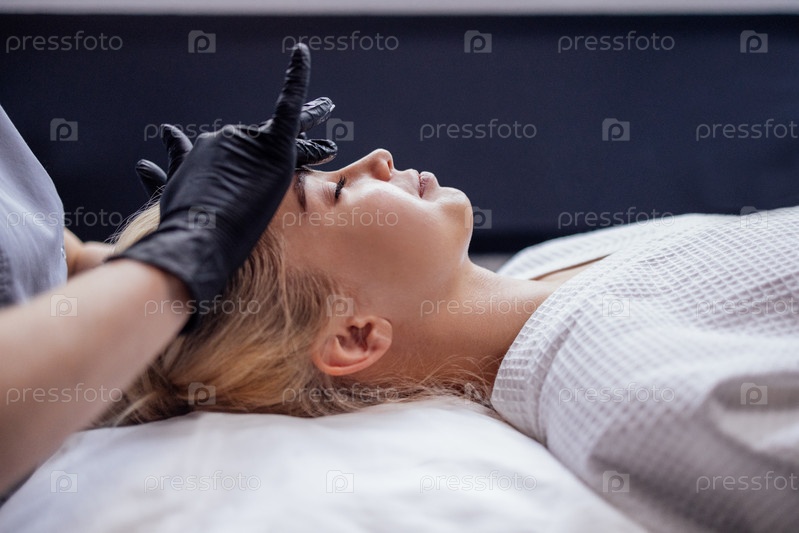 Крупный план портрета молодой привлекательной женщины, получающей массаж лица с кремом