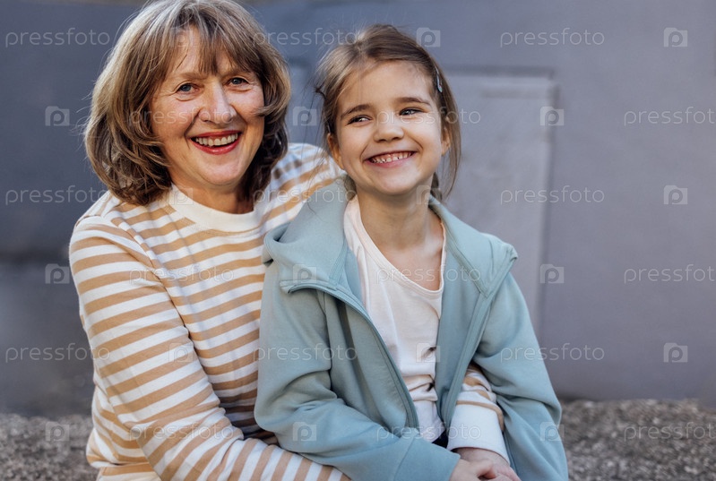 Маленькая девочка обнимает улыбающуюся женщину средних лет. Милая девочка и ее бабушка любят гулять на свежем воздухе