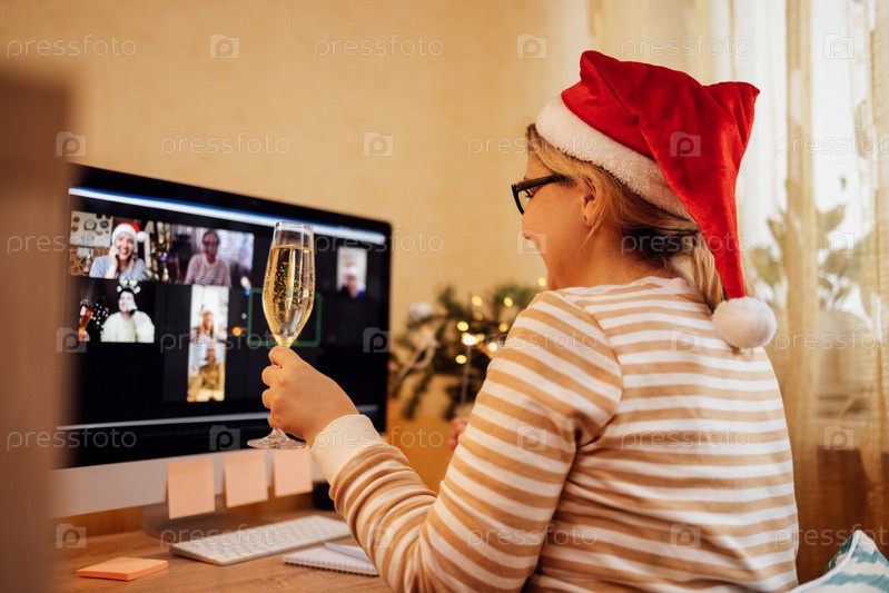 Молодая женщина в шляпе Санты радостно общается по видеосвязи с друзьями