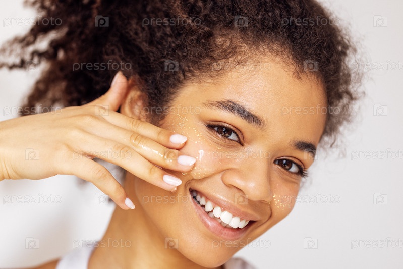 Крупный план портрета очаровательной афроамериканки, наносящей на щеки прозрачный блестящий гель