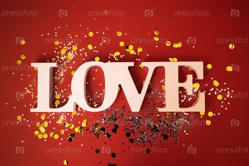Крупным планом слова Любовь на красном фоне. Яркий фон с серебряными блестками и золотыми круглыми конфетти