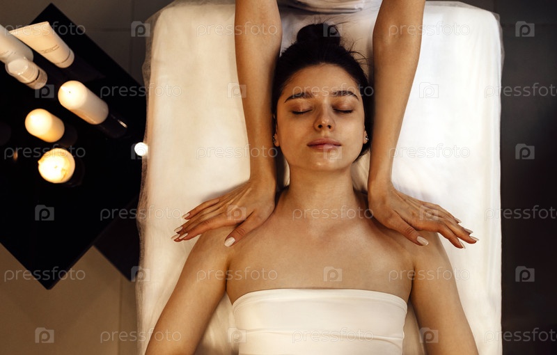 Крупным планом портрет молодой красивой женщины, получающей массаж лица