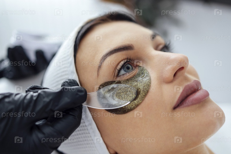 Процедуры в салоне красоты. Крупный план мастера, накладывающего силиконовые пластыри под глаза симпатичной клиентки-брюнетки