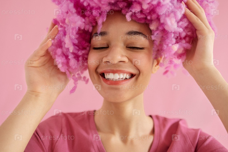 Крупным планом студийный портрет привлекательной милой веселой женщины африканской национальности с красивой белозубой улыбкой. Симпатичная темнокожая девушка с мягким вьющимся розовым париком. Изолированная розовая пекарня. Копирование пространства
