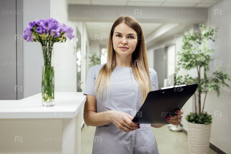 Красивая блондинка с бумажными формами на стойке регистрации