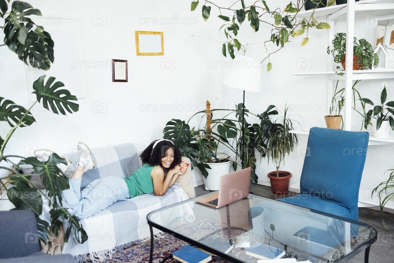 Довольно улыбающаяся африканская американка лежит на диване с ноутбуком и наушниками