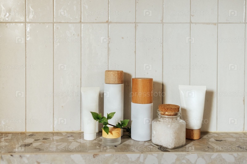 Макеты белых косметических баночек и тюбиков с деревянными крышками. Белая морская соль со стеклянной бутылкой с пробкой и зеленой веточкой с листьями