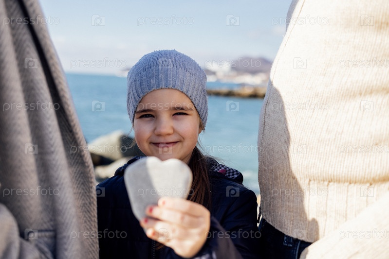 Милая маленькая девочка стоит между родителями и показывает камень в форме сердца. Милая малышка в вязаной шапке и синей куртке на галечном пляже со своими родителями