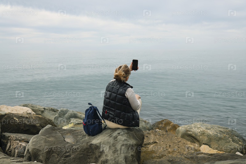 Молодая женщина в повседневной одежде с рюкзаком делает селфи на море