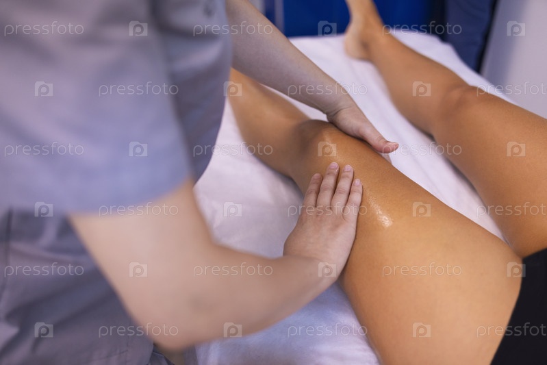 Массаж ног или реабилитация. Массажистка нежно массирует бедро клиентки в спа-салоне