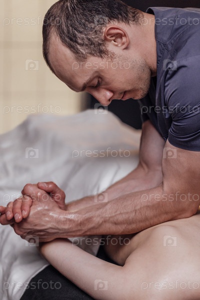 Счастливая молодая кавказская девушка получает массаж спины в спа-салоне. Аккуратные руки массажиста-мужчины