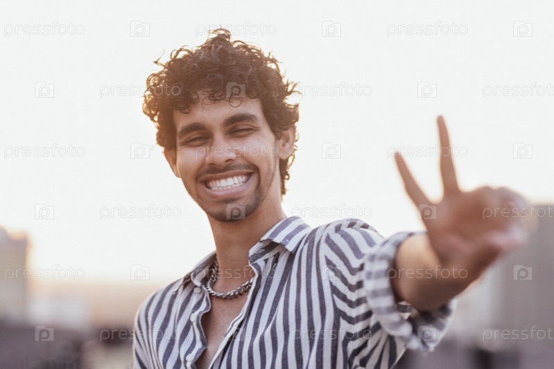 Привлекательный кудрявый парень в полосатой рубашке улыбается на заднем плане