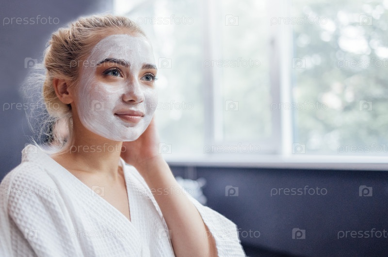 Молодая красивая девушка с белой увлажняющей маской на лице. Голубоглазая блондинка в белом халате делает спа-процедуры в салоне красоты