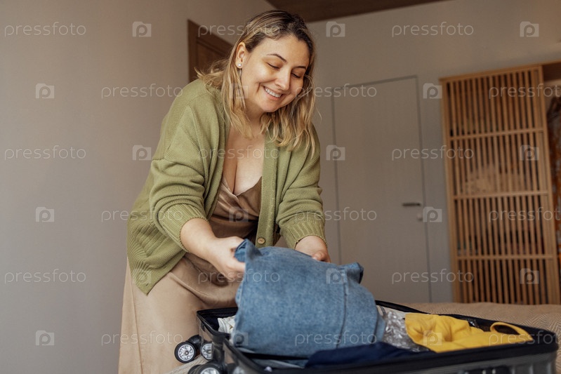 Молодая блондинка в бежевом платье и зеленой куртке улыбается и кладет одежду в чемодан в спальне дома
