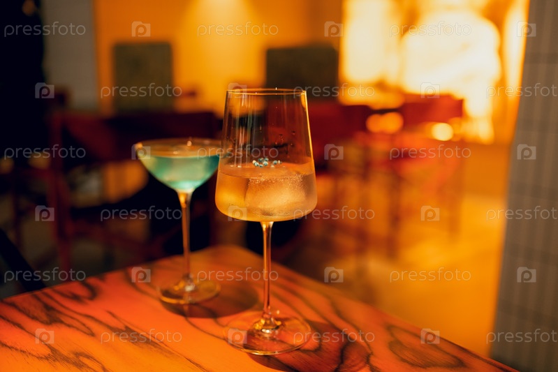 Два вкусных ледяных коктейля в изысканных стаканах стоят на деревянном столе в ресторане