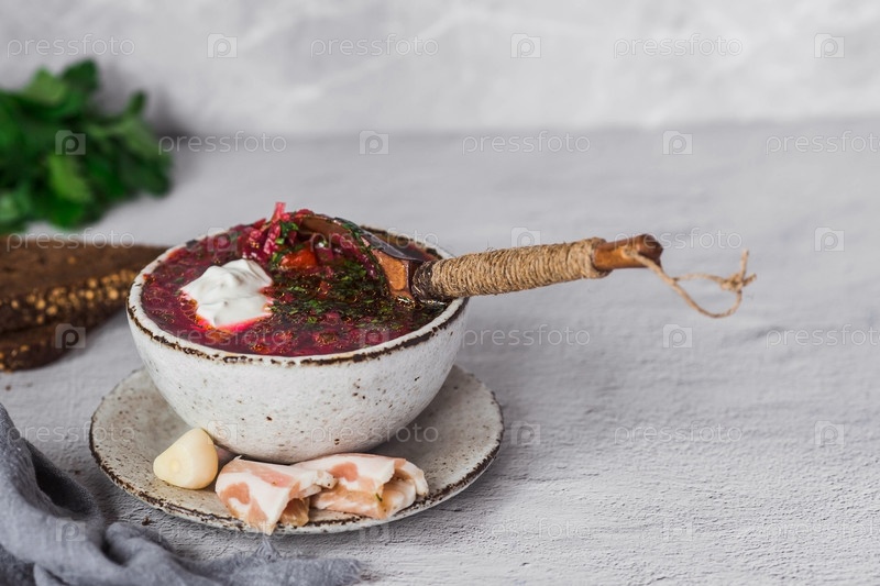 Понятие вкусной еды. Традиционный украинский, русский борщ в стильной керамической тарелке с зеленью, сметаной и чесноком. Свекольный борщ с петрушкой, кориандром и беконом с черным хлебом