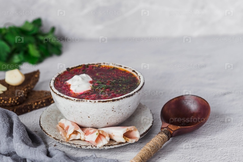 Понятие вкусной еды. Традиционный украинский, русский борщ в стильной керамической тарелке с зеленью, сметаной и чесноком. Свекольный борщ с петрушкой, кориандром и беконом с черным хлебом