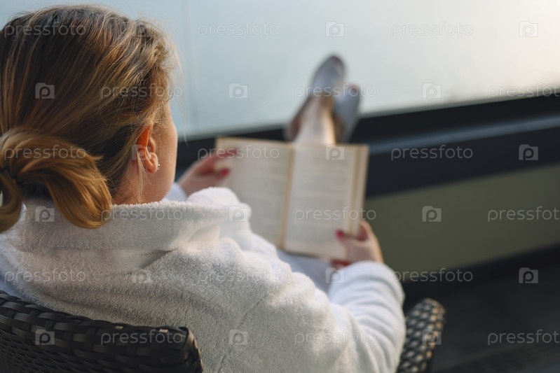 Крупный план портрета молодой женщины в белом халате, сидящей в плетеном кресле на балконе и читающей книгу