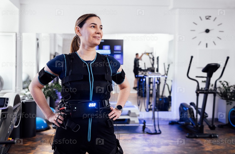 Молодая улыбающаяся женщина позирует в костюме электростимуляции мышц в фитнес-клубе или тренажерном зале