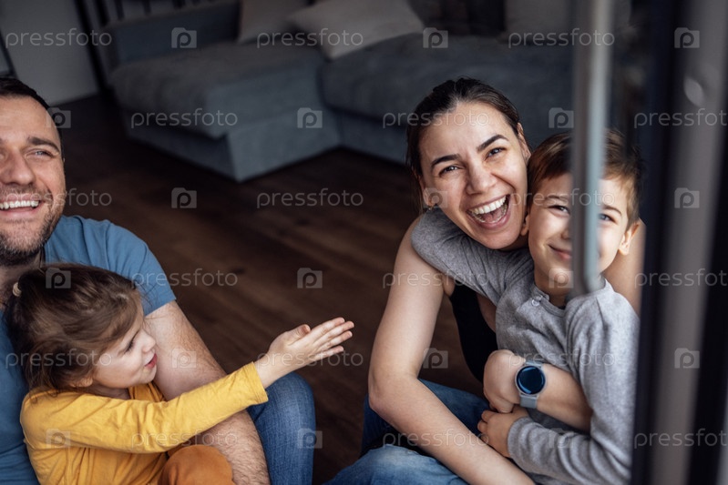 Молодые родители и маленькие дети сидят дома на полу гостиной перед открытым панорамным окном