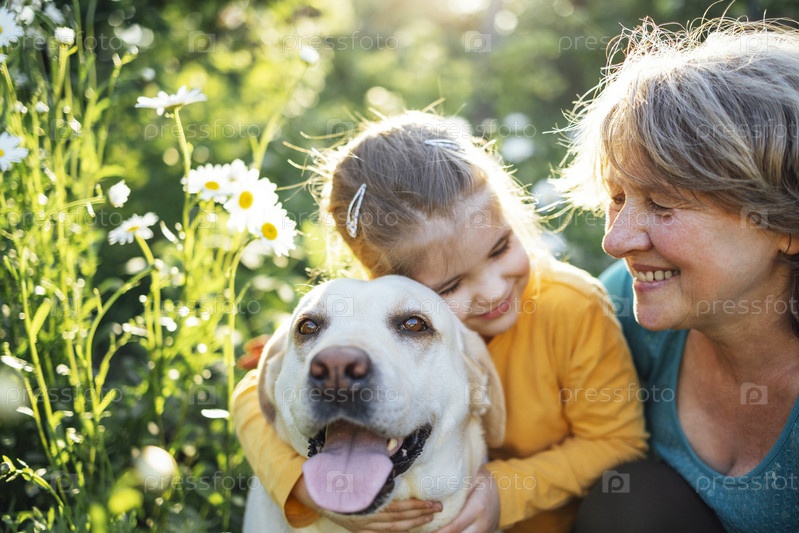 Седая бабушка и милая маленькая внучка вместе выгуливают собак в парке