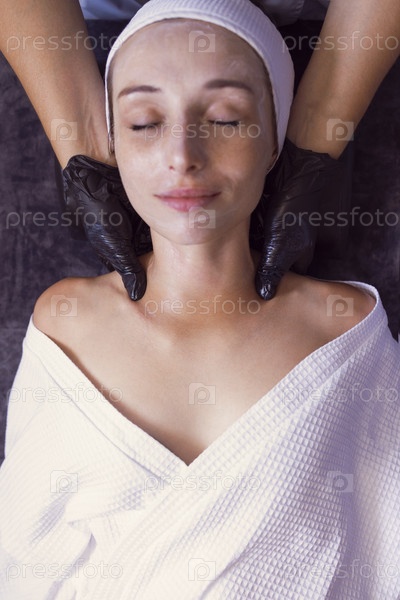 Крупным планом портрет молодой красивой женщины, получающей массаж лица