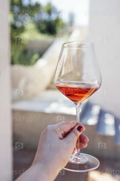 Крупный план элегантного бокала для шампанского с длинным стержнем, стоящего на женской ладони с аккуратным маникюром