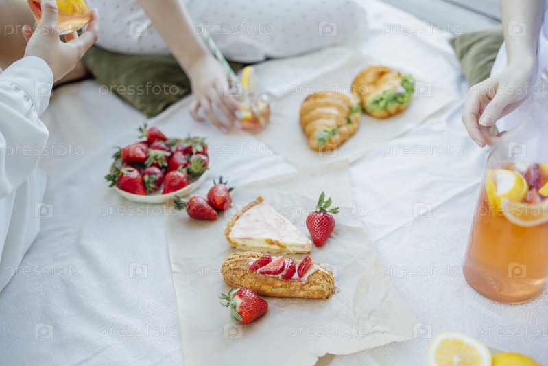 Одеяло с подушками и едой на деревянном мосту. Бутылка клубнично-лимонного смузи