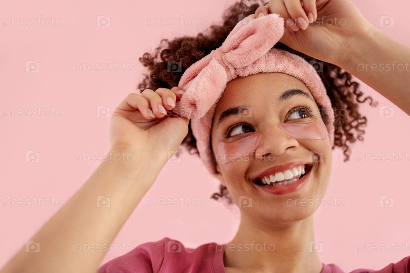 Улыбающаяся привлекательная девушка смешанной расы с чистой кожей и розовыми пятнами под глазами