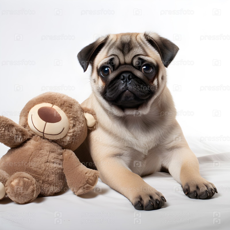 Собака мопс с игрушкой сидит на белом фоне