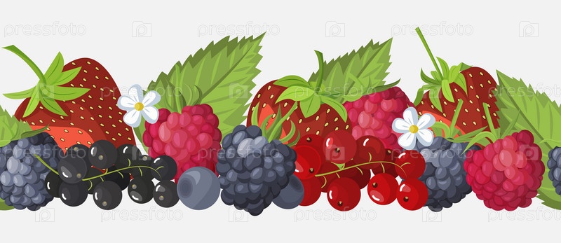 Бесшовный бордюр из свежих ягод. Малина, ежевика, черника, клубника и смородина. Векторная иллюстрация летних фруктов. Горизонтальный бесшовный баннер для яркого, сочного дизайна