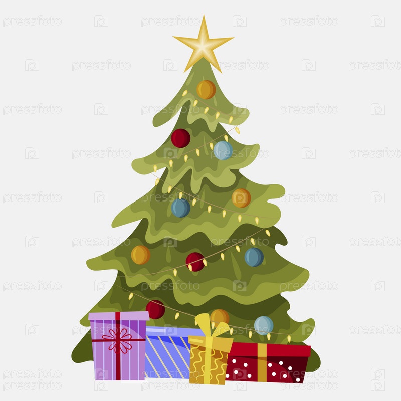 Рождественская елка, украшенная днкоративными шарами, гирляндами, звездой и подарочными коробками. Веселого Рождества и счастливого Нового Года. Векторная иллюстрация в плоском стиле