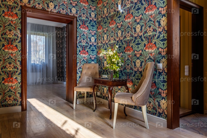 Журнальный столик с букетом и чашкой, стоящий возле лестницы на второй этаж