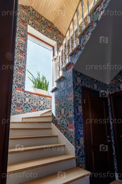Архитектура современного дизайна, современная лестница из натурального дерева в новом доме