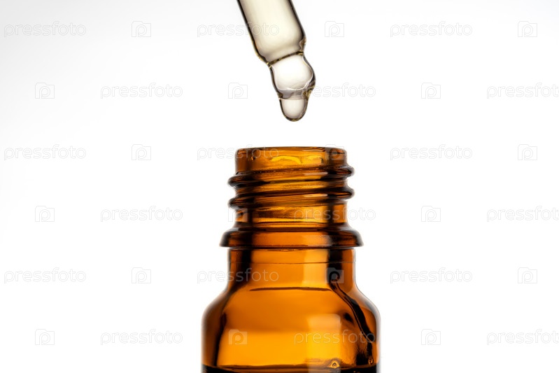Косметическая пипетка с каплей желтой жидкости, льющейся в косметический флакон. Крупным планом, макрос