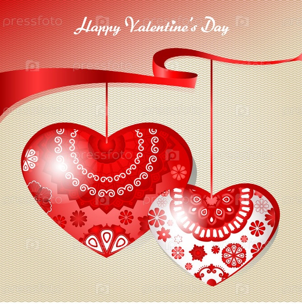 Вектор два украшенных сердца, красная лента
