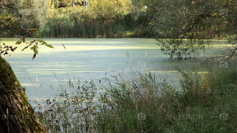 Пруд в парке, покрытый толстым слоем ила
