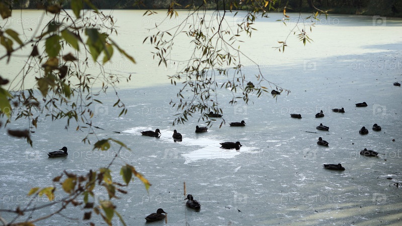 Пруд, листья и утки