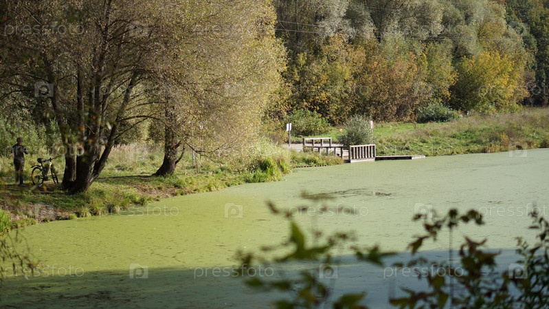 Пруд в парке, покрытый толстым слоем ила