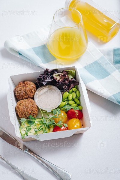 Миска в китайском стиле. фрикадельки с фасолью, зеленью, помидорами черри и соусом в контейнере, вид сверху