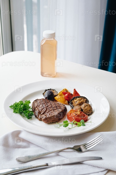 Стейк из говядины с овощами гриль и зеленью на светлом фоне