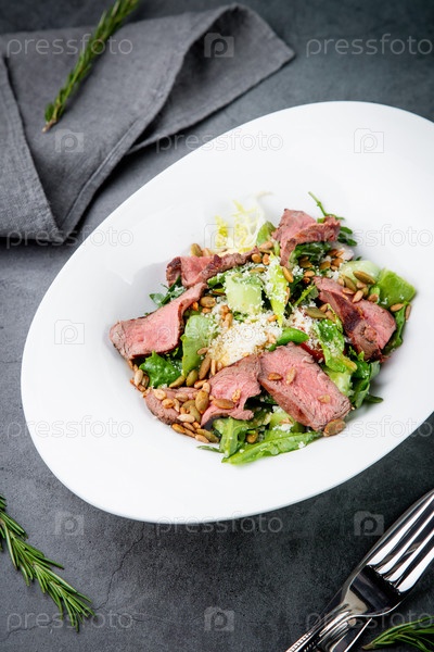 Салат с кусочками говядины, фисташками, салатом и сыром, вид сбоку