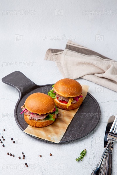 Горячие гамбургеры с салатом и овощами на деревянной доске