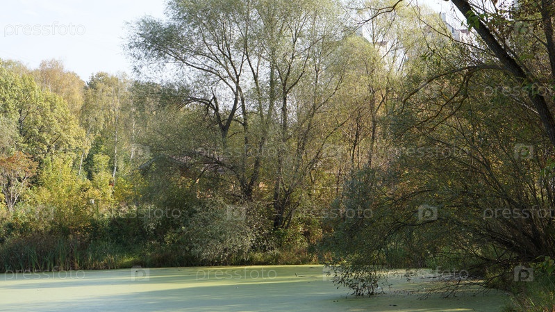 Пруд в парке, покрытый толстым слоем ила