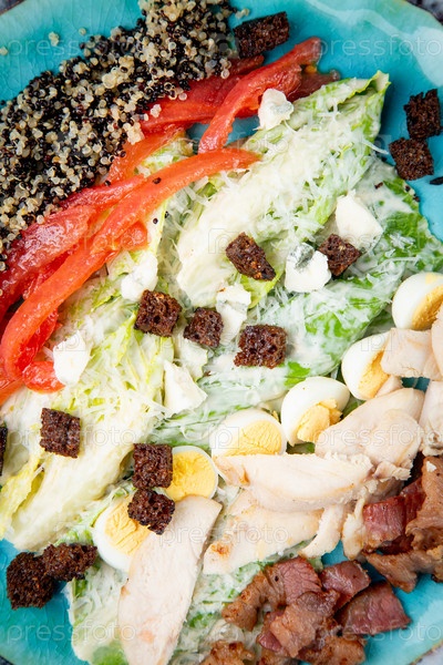Закуска из мяса, перепелиных яиц, болгарского перца, гренок, салата и соуса на синей тарелке, вид сбоку